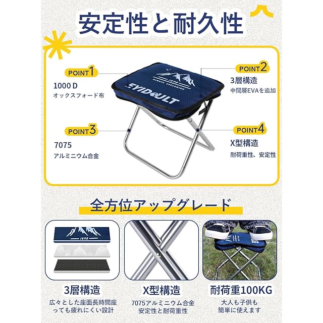 【耐荷重・長持ち】 キャンプ 椅子は丈夫で耐久性のある1000Dオックスフォード生地を採用し、フレーム部分は十分な強度を有している7075アルミニウム合金で作られています。耐荷重、頑丈で安定性のある折り畳み 椅子。大柄な男性が座っても平気な丈夫さで、ご家族、お友達、みなさまお使いいただけます。
