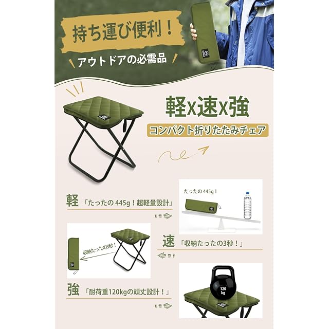 商品名:Lynvora 折りたたみ椅子 ミリタリーグリーン 2025年持ち運びスツール - 座面+41%拡大(35.5×26.5cm) 耐荷重120kg 軽量445g 座高34cm 外径15mmアルミ合金パイプ 耐久性強化設計 コンパクト収納 アウトドアキャンプ/家庭/待时间