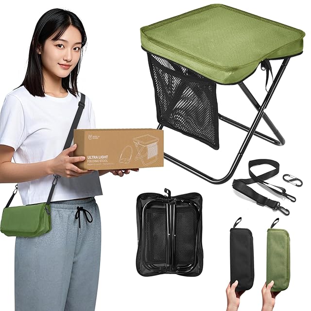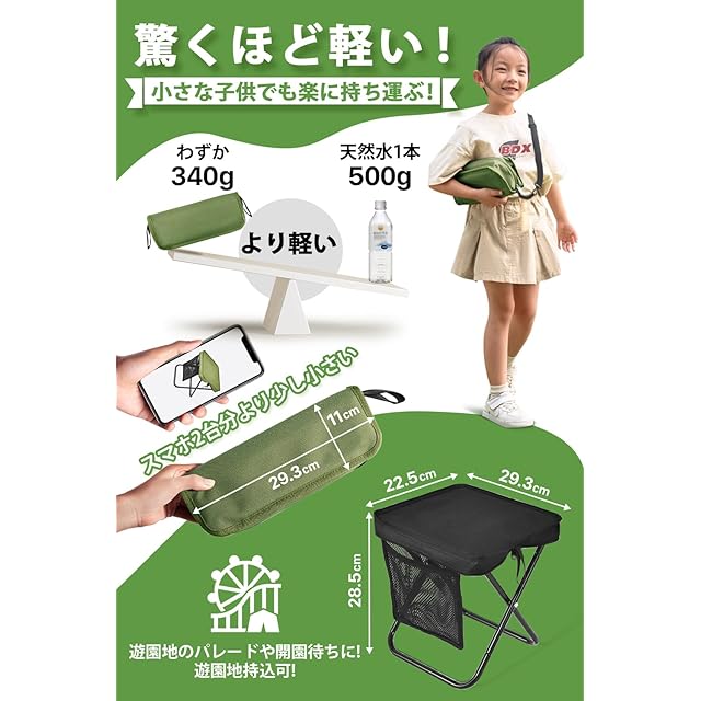 【コンパクトタイプ&安定性】僅か340gで水筒より軽いです。フレーム部分は6013アルミ素材でできており、軽いながら耐荷重は150kgに達しています。持ち手も付きますので、持ち運びに楽々、コンパクトで折りたたみ傘のように使えて便利です。座面は600Dの厚手で丈夫な生地を使い、張りのある安定した座り心地と耐久性を兼ね備えました。また採用のオックスフォード生地は通気性もよく、快適に過ごすことができます。