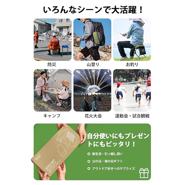 【いろんな場所で活躍】 アウトドア、運動会、釣り、キャンプ、BBQ、 トレッキング、登山 、お花見、花火大会 、バーベキュー、子供様のスポーツ観戦、野外フェス用品など、折りたたみ椅子コンパクトなので携帯していれば、待ち時間にちょっと座ることもできます。