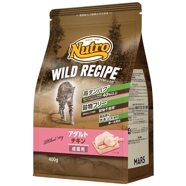 商品名:Nutro ワイルドレシピ 成猫用 グレインフリー アダルト チキン 400g ドライフード 総合栄養食 キャットフード 猫 お試し 穀物フリー 高タンパク 厳選自然素材 香料・着色料 無添加 ニュートロ
