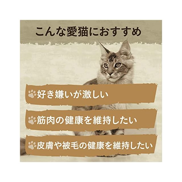 穀物は原材料として使わず、消化性に優れた高品質なエンドウマメやポテトを使用。穀物の消化が苦手な愛猫の健康維持と消化吸収に配慮しています。