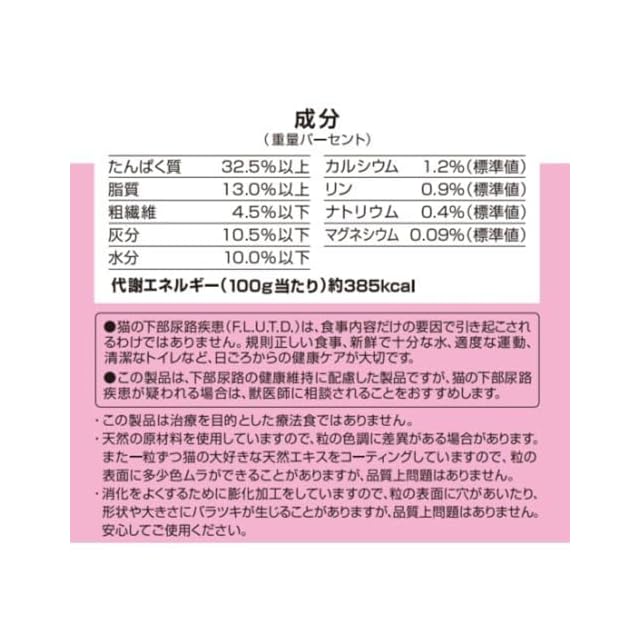 穀類(とうもろこし、コーングルテンミール)、肉類(ミートミール、チキンミール、チキンレバーパウダー)、豆類(おから)、油脂類(動物性油脂)、魚介類(フィッシュミール:DHA・EPA源、フィッシュエキス)、糖類(フラクトオリゴ糖)、卵類(ヨード卵粉末)、シャンピニオンエキス、ビタミン類(A、D3、E、K3、B1、B2、パントテン酸、ナイアシン、B6、葉酸、ビオチン、B12、コリン、イノシトール)、ミネラル類(カルシウム、リン、ナトリウム、カリウム、塩素、鉄、コバルト、銅、マンガン、亜鉛、ヨウ素)、アミノ酸類(メチオニン、トリプトファン、タウリン)、酸化防止剤(ローズマリー抽出物、ミックストコフェロール)