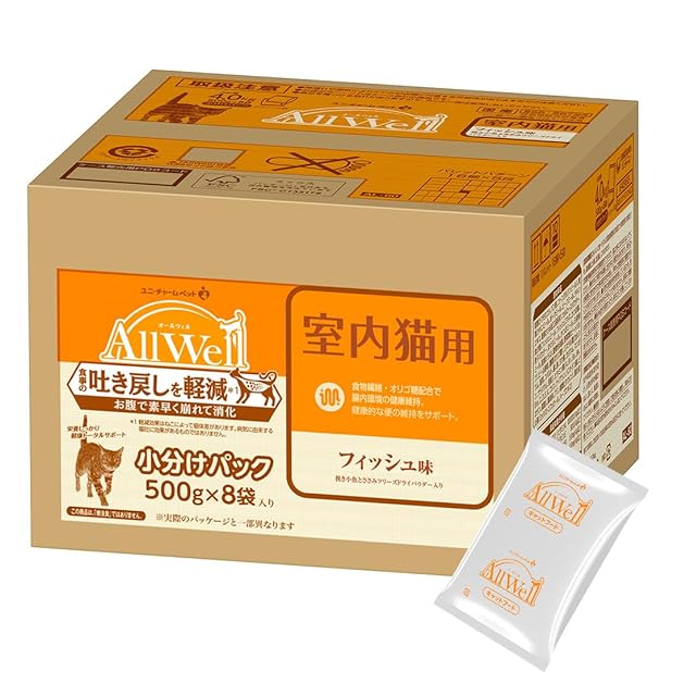 [吐き戻し軽減] All Well(オールウェル) キャットフード ドライ [室内猫用] フィッシュ 4.0kg(500g×8袋)【国産/小分けパック/ケース品】