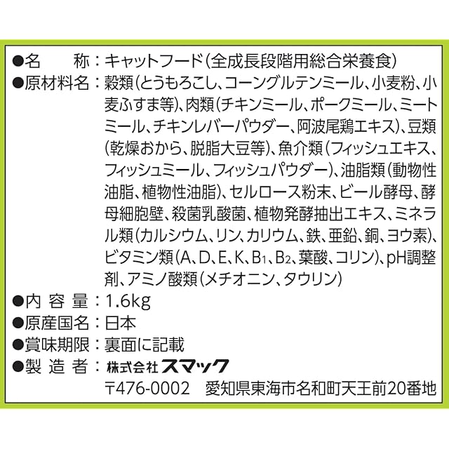 穀類(とうもろこし、コーングルテンミール、小麦粉、小麦ふすま等)、肉類(チキンミール、ポークミール、ミートミール、チキンレバーパウダー、阿波尾鶏エキス)、豆類(乾燥おから、脱脂大豆等)、魚介類(フィッシュエキス、フィッシュミール、フィッシュパウダー)、油脂類(動物性油脂、植物性油脂)、セルロース粉末、ビール酵母、酵母細胞壁、殺菌乳酸菌、植物発酵抽出エキス、ミネラル類(カルシウム、リン、カリウム、鉄、亜鉛、銅、ヨウ素)、ビタミン類(A、D、E、K、B1、B2、葉酸、コリン)、pH調整剤、アミノ酸類(メチオニン、タウリン)