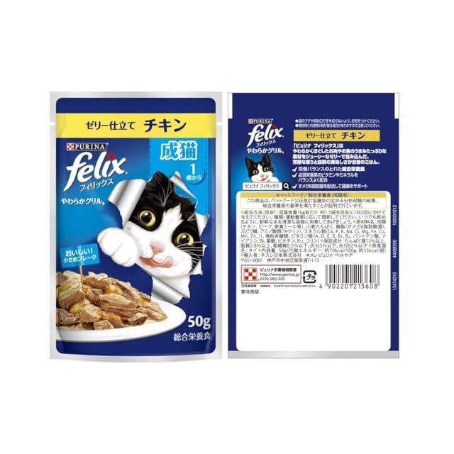 原材料:【成猫用 ゼリー仕立て ツナ】肉類(チキン、ビーフ、家禽ミール 等)、小麦たんぱく、魚介類(ツナ 等)、鶏脂(オメガ6脂肪酸源)、ぶどう糖、アミノ酸類(タウリン)、ミネラル類(Ca、P、K、Na、Cl、Mg、Fe、Cu、Mn、Zn、I)、増粘多糖類、ビタミン類(A、D、E、K、B1、B2、パントテン酸、ナイアシン、B6、葉酸、ビオチン、B12、コリン)、着色料(酸化鉄) 【成猫用 ゼリー仕立て サーモン】肉類(チキン、ビーフ、家禽ミール 等)、小麦たんぱく、魚介類(サーモン 等)、鶏脂(オメガ6脂肪酸源)、ぶどう糖、アミノ酸類(タウリン)、ミネラル類(Ca、P、K、Na、Cl、Mg、Fe、Cu、Mn、Zn、I)、増粘多糖類、ビタミン類(A、D、E、K、B1、B2、パントテン酸、ナイアシン、B6、葉酸、ビオチン、B12、コリン)、着色料(酸化鉄)