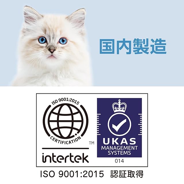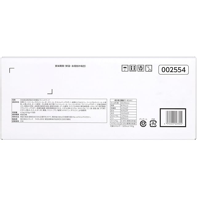 原材料名:肉類(ミートミール、チキンミール、ポークミール、チキンレバーパウダー)、穀類(とうもろこし、コーングルテンミール、小麦粉、小麦ふすま、オーツ麦等)、でん粉類、魚介類(フィッシュミール、フィッシュエキス、フィッシュパウダー)、豆類(乾燥おから、脱脂大豆等)、油脂類(動物性油脂、植物性油脂)、ビール酵母、サイリウム粉末、酵母細胞壁、L-カルニチン酒石酸塩、クランベリーパウダー、殺菌乳酸菌、植物発酵抽出エキス、ミネラル類(カリウム、カルシウム、リン、鉄、亜鉛、銅、ヨウ素)、ビタミン類(A、D、E、K、B1、B2、葉酸、コリン)、アミノ酸類(メチオニン、タウリン)、pH調整剤