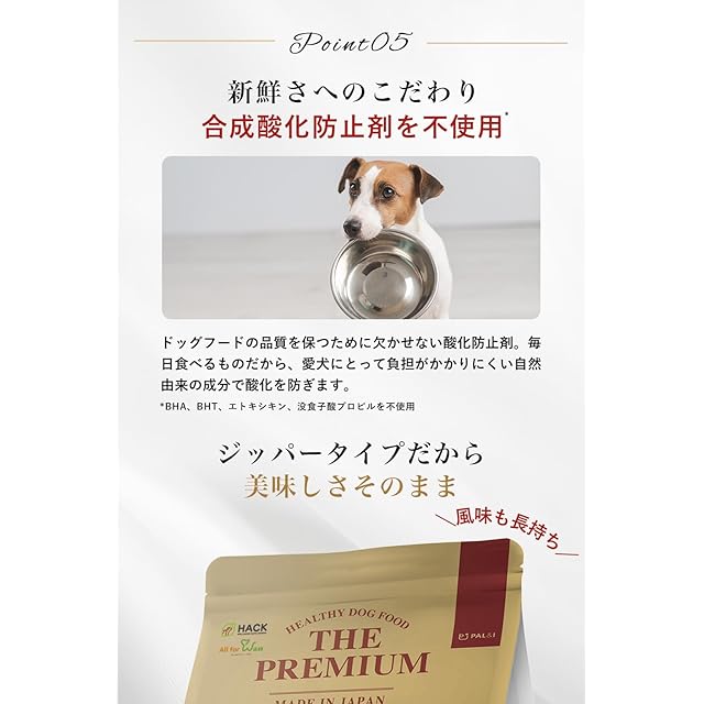 ✅品質を保ちつつ、愛犬にとって負担のかかりにくい自然由来成分を採用した「天然の酸化防止剤」を使用しています。さらにジッパータイプのパッケージなので、風味も長持ちします。