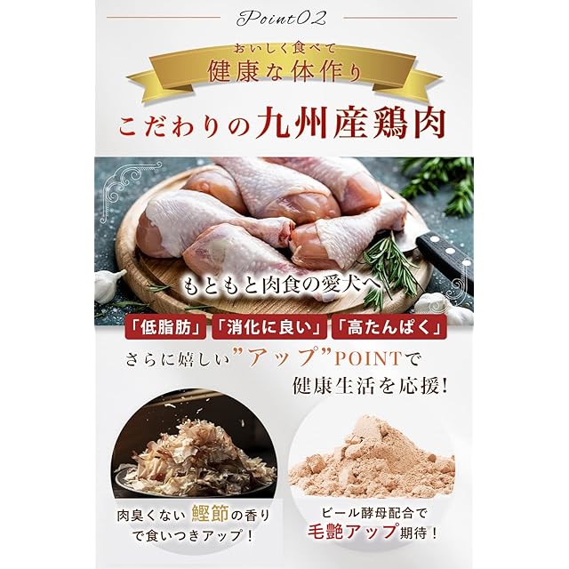 ✅ヒューマングレードの国産主原料を使用。低脂肪で高たんぱくな九州産若鶏、ミネラル・ビタミンが豊富なたっぷり野菜、ふわっと香る鰹節、毛並み/毛艶アップが期待できるビール酵母など、こだわりの食材で製造しています。
