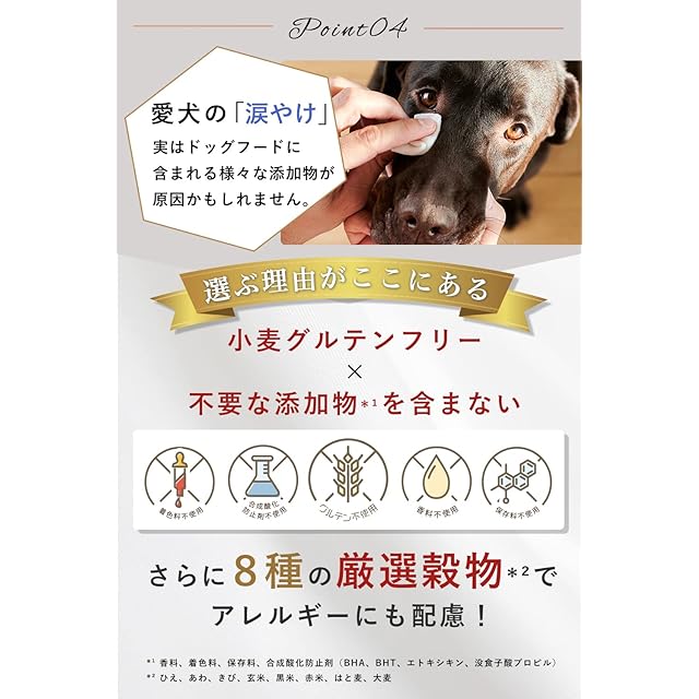 ✅グルテンフリー×不要な添加物*不使用なので、「涙やけ」ケアにピッタリ。(*香料、着色料、保存料、合成酸化防止剤)。さらに8種の厳選穀物*は契約農家さんが丹精込めてつくったもので栄養たっぷり!アレルギーにも配慮しています。(*ひえ、あわ、きび、玄米、黒米、赤米、はと麦、大麦)。