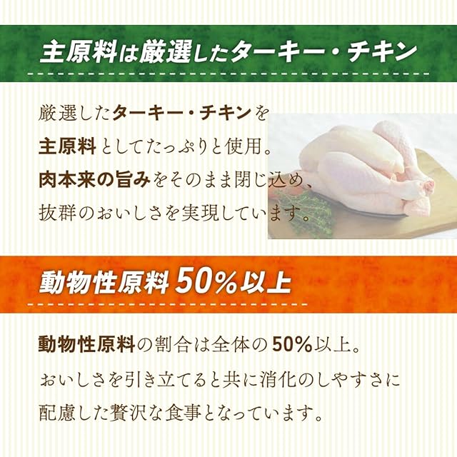 【高タンパク質】たんぱく質33%以上。主原料は厳選したターキー、チキンを使用しています。