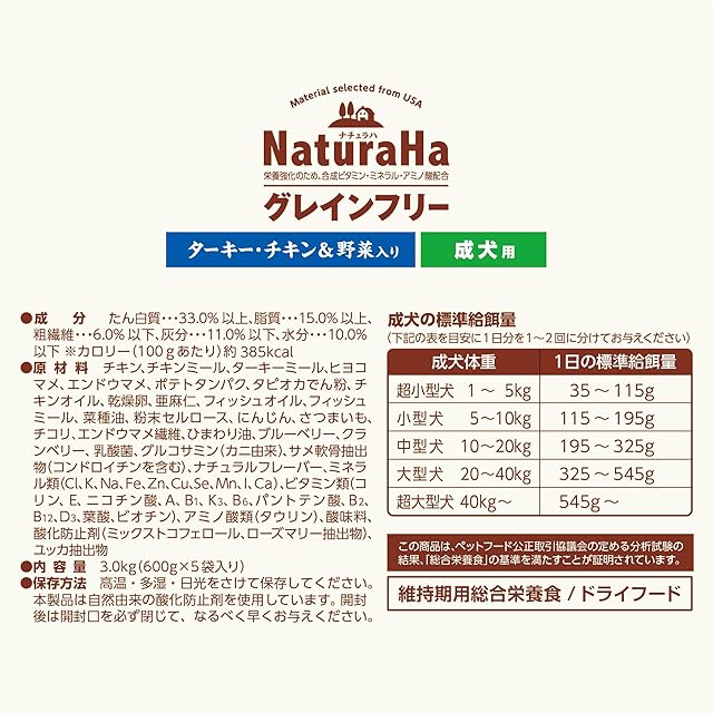 商品名:サンライズ ナチュラハ ドッグフード グレインフリー ターキー・チキン&野菜入り 成犬用 3kg(600g×5袋) 小粒 高タンパク質 アダルト 総合栄養食 【.co.jp限定】