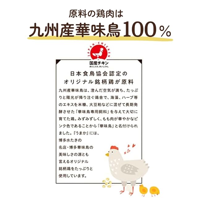 【うまか】自社の養鶏場で大切に育てた「華味鳥」の新鮮な生肉を使用した、安心・安全で、健康にも配慮した美味しい国産ドッグフードです。新鮮な生肉をそのまま使用しているため、フードの形にばらつきがある場合がありますが、これこそが素材の良さの証です。