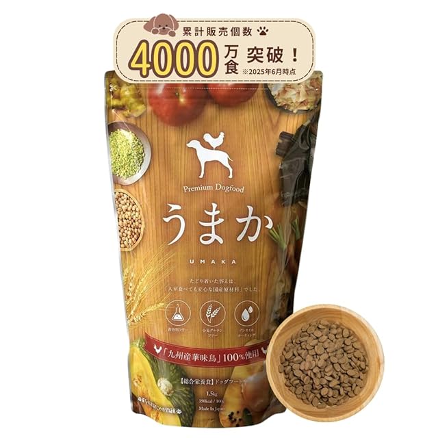 【商品紹介】<br /> UMAKAは、水たき料亭 博多華味鳥が作ったプレミアムな国産ドッグフードです。 人間もおいしく食べられる新鮮な鶏肉である、自社飼育の華味鳥を原材料に100%使いました。安全にこだわり、香料、着色料、オイルコーティングなど一切不使用です。<br /> <br /> 【原材料】<br /> 鶏肉、玄米、大麦、かつお節、大豆、ビール酵母、チキンエキス、米油、卵黄粉末、発行調味液、フラクトオリゴ糖、りんご、にんじん、かぼちゃ、昆布、しいたけ、コンドロイチン、セレン酵母、しょうが、ビフィズス菌、グルコサミン、L-トレオニン、ミネラル類(牛骨カルシウム、塩化カリウム、塩化ナトリウム、グルコン酸亜鉛、ピロリン酸第二鉄、グルコン銅)、ビタミン類(ビタミンA、ビタミンD、ビタミンE、ビタミンB2、ビタミンB12、パントテン酸カルシウム)<br /> <br /> 【成分値】<br /> エネルギー 350kcal/100g<br /> たんぱく質 21.4%以上<br /> 脂質 9.5%以上<br /> 粗繊維 0.8%以下<br /> 灰分 6.8%以下<br /> 水分 10.0%以下<br /> <br /> 【保存方法】 <br /> 高温多湿・直射日光を避けて常温で保管してください。開封後は1ヶ月を目安にお与えください。