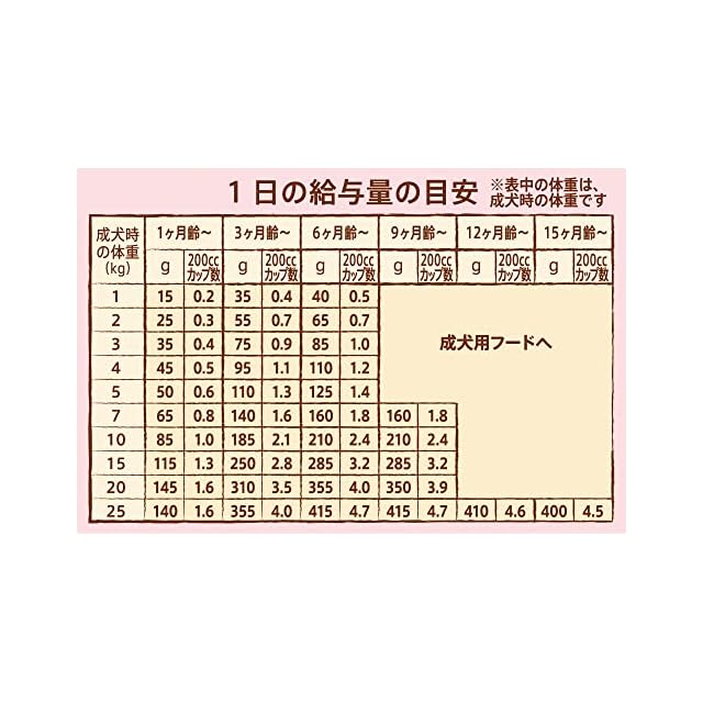 本品は、良質なタンパク質と脂質を調整し、子犬の健康な発育のために栄養バランスに配慮しています。また、ペットフード公正取引協議会の定める分析試験の結果、総合栄養食の基準を満たすことが証明されています。AAFCO(米国飼料検査官協会)規定の分析試験により、バランスの良い総合栄養食であることが証明されています。