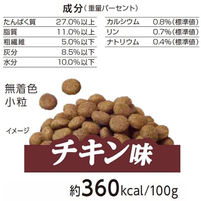 成分:たんぱく質27.0以上 脂質11.0%以上 粗繊維5.0%以下 灰分8.5%以下 水分10.0%以下