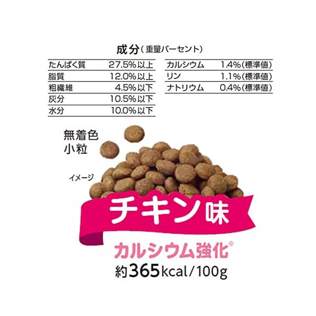 成分:たんぱく質27.5%以上 脂質12.0%以上 粗繊維4.5%以下 灰分10.5%以下 水分10.0%以下