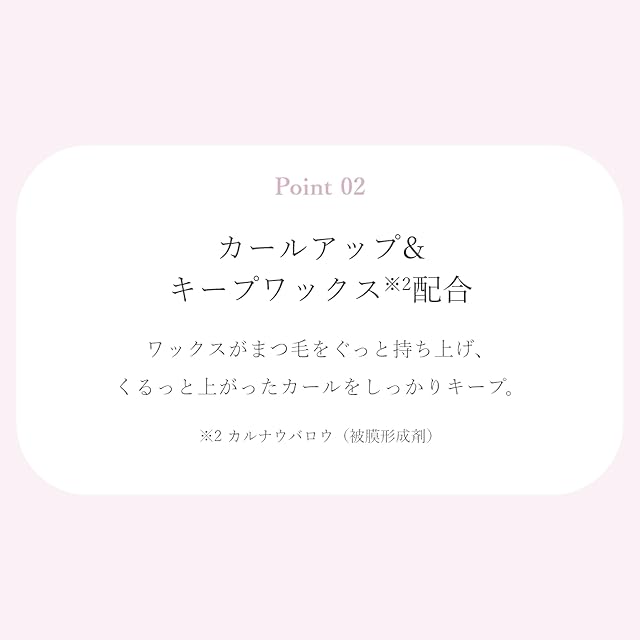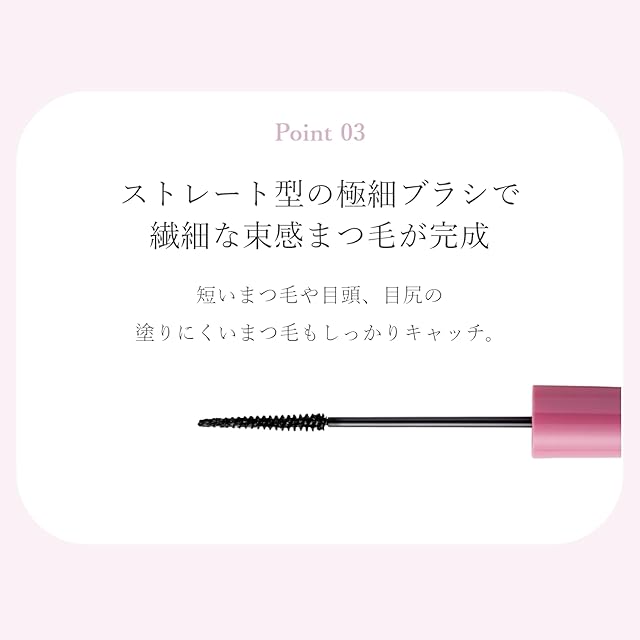 ○ダマなく塗れるセパレート処方:サラサラ質感の液が、1本1本放射状にまつ毛を伸ばす*1 *1メイクアップ効果による○カールアップ&キープワックス*2配合:ワックスがまつ毛をぐっと持ち上げ、くるっと上がったカールをしっかりキープ*2 カルナウバロウ○ストレート型の極細ブラシで繊細な束感まつげが完成:○2種の美容液成分inパンテノール、加水分解シルク(すべて保湿成分)