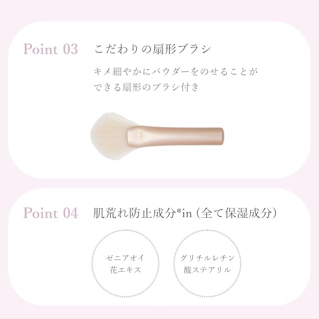 POINT03 こだわりの扇形ブラシ:キメ細やかにパウダーをのせることができる扇形のブラシ付き