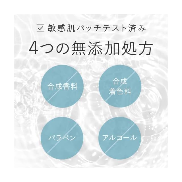 【低刺激処方】肌への刺激性を考えた、アルコール、合成香料、合成着色料、パラベンの4つの成分フリーの肌に優しい無添加設計に。また、敏感肌の方の協力によるパッチテスト済です。
