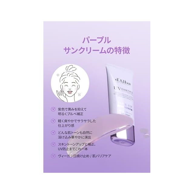 商品名:【d'Alba公式】トーンアップ UVエッセンス サンクリーム - SPF50+/PA++++ 化粧下地 日焼け止め 美容液 汗と水に強い ウォータープルーフ イージーウォッシャブル 一度に落とせる ファンデフリー 紫外線 敏感肌 乾燥肌 低刺激 顔 全身用 ヴィーガン (パープル 35ml)