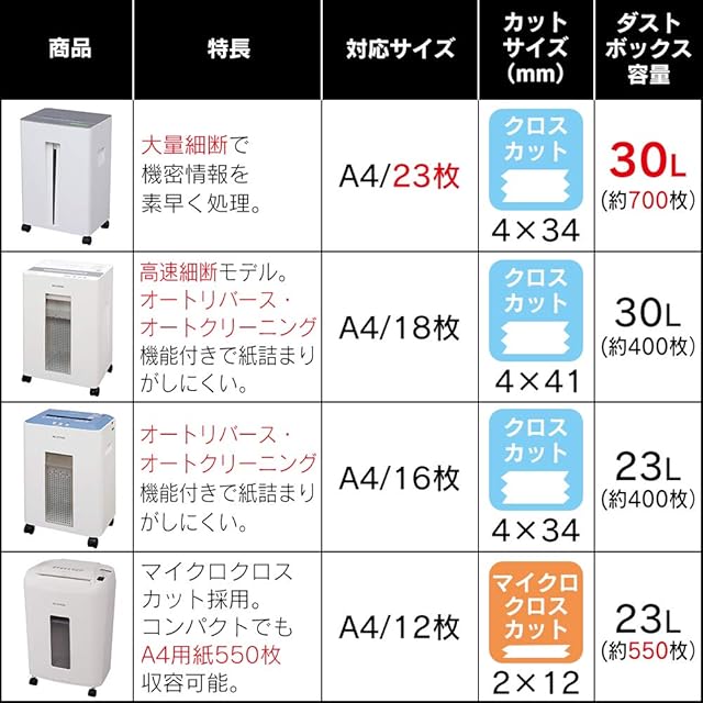 【オートクリーニング機能】:紙が詰まりにくい状態を保つ。 細断中5回に1回、自動で清掃運転。 刃に残った細断くずを落とす。
