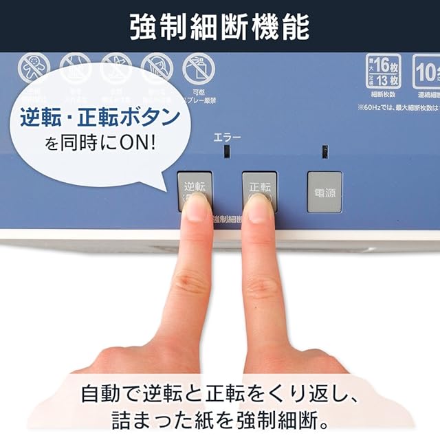 【強制細断機能】:万が一、紙が詰まっても安心。 逆転と正典のボタンを同時に押すと、自動で逆転と正転をくり返し、詰まった紙を強制的に細断する。