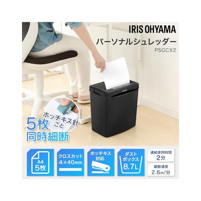 アイリスオーヤマ シュレッダー 家庭用 クロスカット 卓上 コンパクト 容量8.7L 細断枚数5枚 静音 小型シュレッダー P5GCX2 ブラック