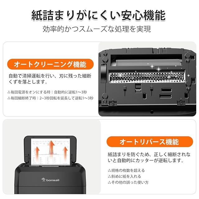 【紙詰まり防止】オートクリーニング&オートリバース機能搭載で、紙詰まりを未然に防止。電動シュレッダーの性能を最大限に活かし、ストレスのない快適な使用体験を実現します。