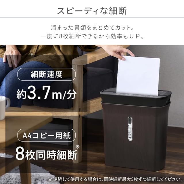 商品名:【.co.jp限定】アイリスオーヤマ シュレッダー 家庭用 高速細断3.7m/分 細断枚数8枚 クロスカット 連続使用3分 ダストボックス8.9L A4/65枚収容 コンパクト AZ-P8GCD-B ブラック 黒