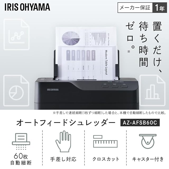 【.co.jp限定】アイリスオーヤマ オートフィードシュレッダー 業務用シュレッダー クロスカット 自動紙送り機能 オートリバース機能 自動細断60枚 AZ-AFSB60C ブラック