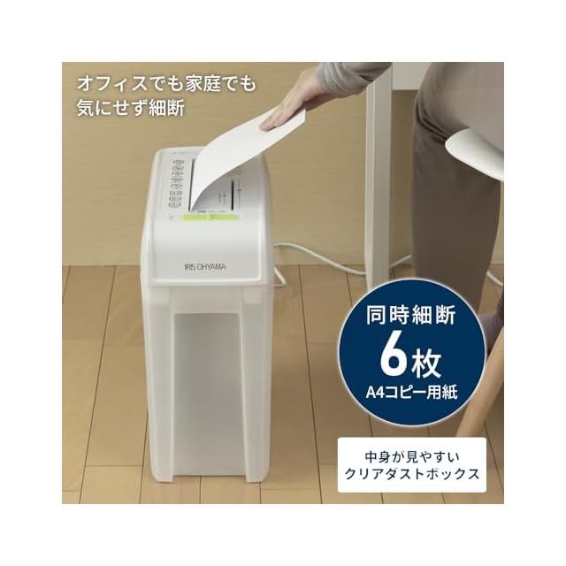 商品名:アイリスオーヤマ シュレッダー 家庭用 細断枚数6枚 クロスカット 連続使用3分 CD/DVD/カード対応 ダストボックス8.8L A4/108枚収容 コンパクト P6HC ホワイト