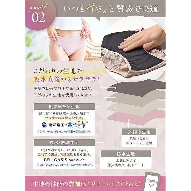 吸水ショーツは、生理中の女性のための便利な下着です。しっかりと吸収し、漏れを防ぐことができます。通気性のある素材で作られているため、蒸れにくく、さらさらとした肌触りです。レースのデザインが上品な印象を与え、気分も上がります。ノーマルタイプとレースタイプの2種類から、お好みのデザインをお選びいただけます。サイズはM、L、LLの3種類をご用意しています。生理時の悩みから解放され、快適な毎日をお過ごしいただけます。