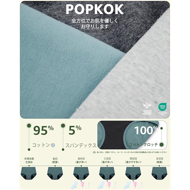 【特別な日にも安心】ポップコーのサニタリショーツは本体、防水層、吸水層とインナークロッチ4層の構造で、特別な日に追加の保護を提供できます。防水シートを徹底的に幅アップ、お尻部だけではなく、前の部分も更に幅アップ。最大限な幅広に仕上げ、特別な日にも安心して快適に過ごせます。
