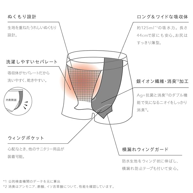 Bé-A〈ベア〉の吸水ショーツが1枚3役に! サニタリー期間も、 尿もれ、温活も。 <この吸水ショーツ1枚で 約125ml*4もの液体をしっかり吸水!細部までこだわりの吸収体で、 全方位漏れにくい設計に> 吸収体の中央に入れた隠れステッチが、液体をすばやく吸水。さらに横漏れをせき止めるウイングガードと横漏れ防止テープも付いて、長時間でも安心です。 シグネチャー 04モデルからは、液体をはじく防水布を前側にも延長!吸収体をぐるりと囲いこみ、前後・左右の漏れを徹底ガードします。