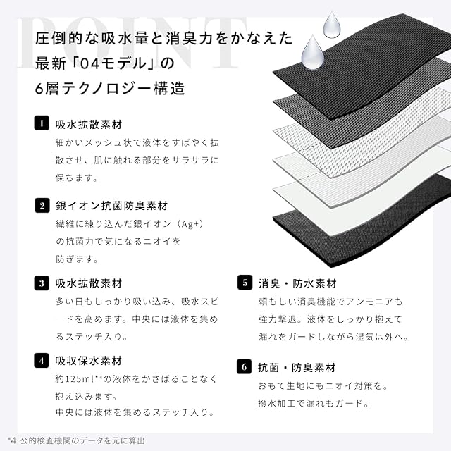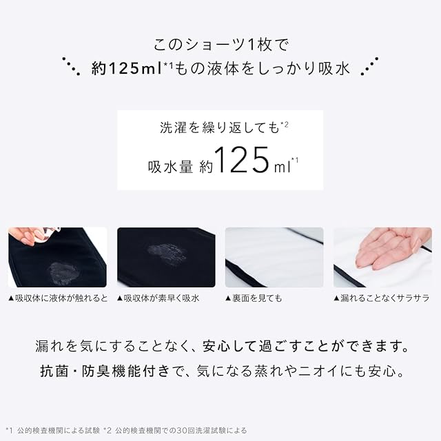 <抜群の吸水量で、 多い日も漏れを気にせず安心> Bé-A〈ベア〉の吸水量は、驚異の約125ml*4。多い日の平均量が30〜50ml*6といわれる中、Bé-Aはその3倍以上もの吸水量を実現。より長くご使用いただくために耐久性にもこだわり、洗濯試験も行っています。 また、Bé-A〈ベア〉は吸水量テストを「吸収体中心部」と「吸収体前部+中心部+後部」の両方で実施。中心部だけでも十分な吸水量を保ちながら、前漏れやうしろ漏れもガードできるように、前部や後部の吸水量もしっかりと計測しています。 ※4 公的検査機関のデータを元に算出 ※6 量には個人差があります <はじめての吸水ショーツべたつかない?> 肌に触れる生地は、細かい凹凸のメッシュ状のポリエステルを採用。接地面積を少なくして、冷えや蒸れなど肌へのストレスを減らせるように工夫をしています。水分が生地に触れるとすばやく拡散、蒸発。サラサラとした肌あたりを叶えます。