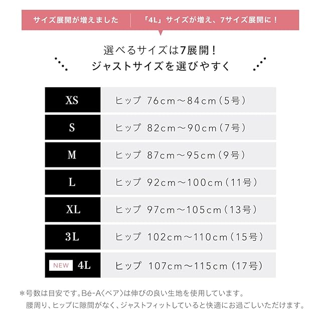 XS:ヒップ 76cm~84cm(5号) S:ヒップ 82cm~90cm(7号) M:ヒップ 87cm~95cm(9号) L:ヒップ 92cm~100cm(11号) XL:ヒップ 97cm~105cm(13号) 3L:ヒップ 102cm~110cm(15号) 4L:ヒップ 107cm~115cm(17号) ※号数は目安です。Bé-A〈ベア〉は伸びの良い生地を使用しています。腰周り、太もも周りに隙間がなく、ジャストフィットしていると快適にお過ごしいただけます。 <初めてご使用の前にお願いしたいこと> おろしたての生地は液体を弾きやすいため、正しく吸水力を発揮するために、ご使用前に一度洗濯機での予洗いをしてください。 少量の洗剤でショーツ単体を洗い、自然乾燥ののちお使いいただけます。 使い心地に慣れていただくためにも、最初はご自宅にいる時間が長い日や量の少ない日から徐々にお試しください。