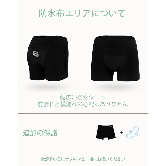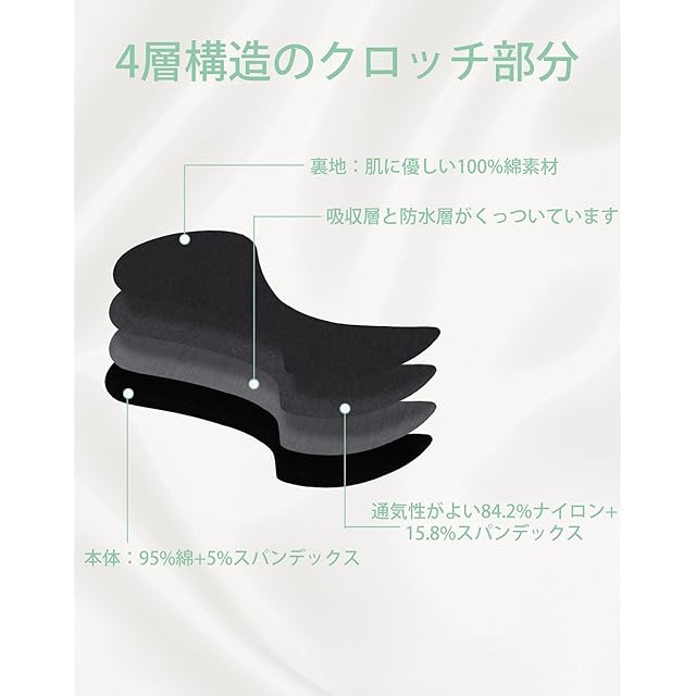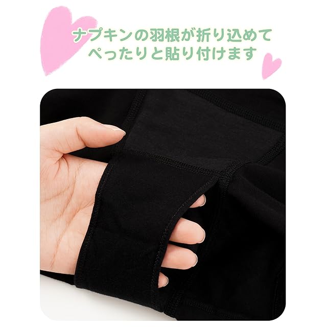 【クロッチ部分】4層構造のクロッチ部分、吸水機能と防水機能を兼ね備えて、漏れ防止ができます。幅広い防水シート、前漏れと横漏れの心配はありません。昼はもちろん、夜も安眠できます。そして、クロッチ部分はダブルクロッチ仕様で、ナプキンの羽根が折り込めて、ぺったりと貼り付けて、日常生活にもっと便利になります。