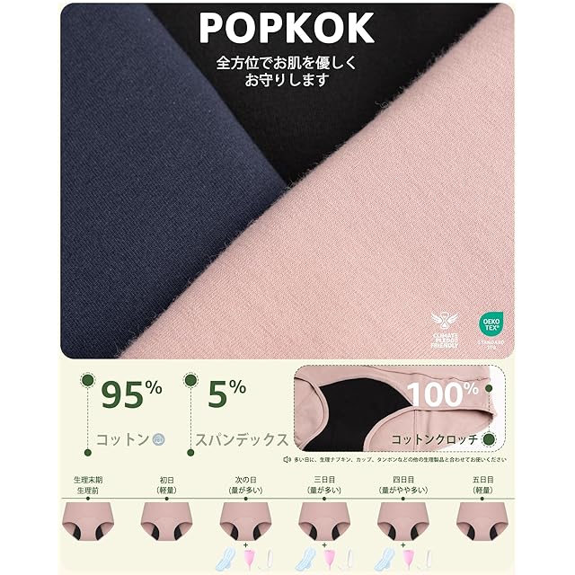 【特別な日にも安心】ポップコーのサニタリショーツは本体、防水層、吸水層とインナークロッチ4層の構造で、特別な日に追加の保護を提供できます。防水シートを徹底的に幅アップ、お尻部だけではなく、前の部分も更に幅アップ。最大限な幅広に仕上げ、特別な日にも安心して快適に過ごせます。