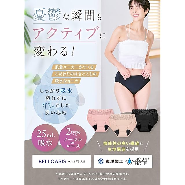 吸水ショーツは、生理中の女性のための便利な下着です。しっかりと吸収し、漏れを防ぐことができます。通気性のある素材で作られているため、蒸れにくく、さらさらとした肌触りです。レースのデザインが上品な印象を与え、気分も上がります。ノーマルタイプとレースタイプの2種類から、お好みのデザインをお選びいただけます。サイズはM、L、LLの3種類をご用意しています。生理時の悩みから解放され、快適な毎日をお過ごしいただけます。