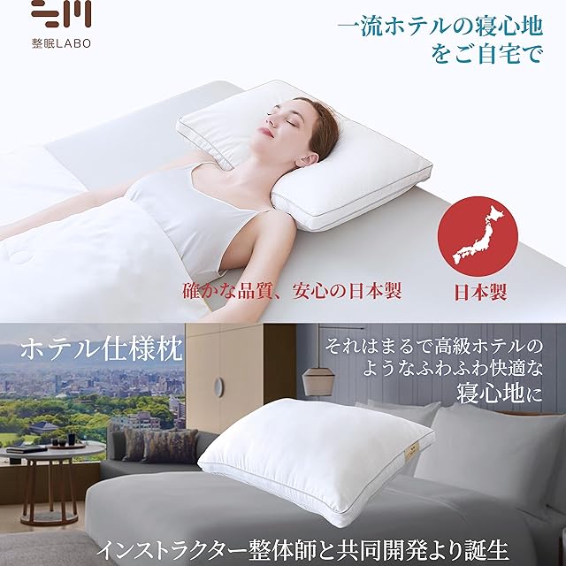 【整眠ラボ日本製高級ホテル仕様】羽毛のように柔らかな感触で包み込むフィット感、ご自宅でホテルのような贅沢睡眠体験!心地よさを追求したホテルスタイルのまくらが上質な眠りを演出します。