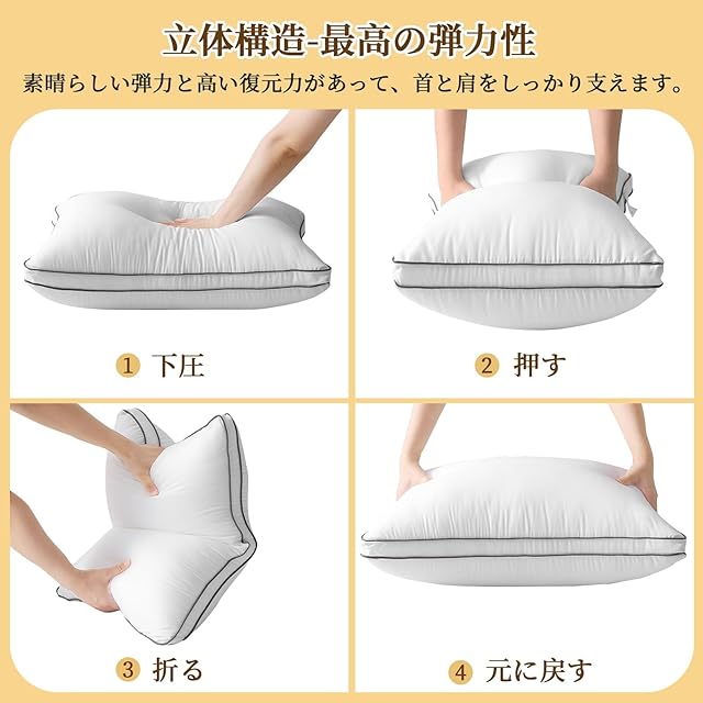 【高反発-復元力を持ち】1000gの3Dポリエステル素材をボリュームたっぷりに詰め込み、羽毛相当の柔らかさを持つ同時にふっくらとした復元力を実現します。寝ている間、首の位置を自然な状態に保ちます。ゆっくりと沈み込み、頭の形に優しくぴったりフィットします。どのような寝返りをうっても頭や首を安定させてくれます。横向き寝・仰向け寝・うつ伏せ寝、お好きな寝姿でぐっすり眠れます。