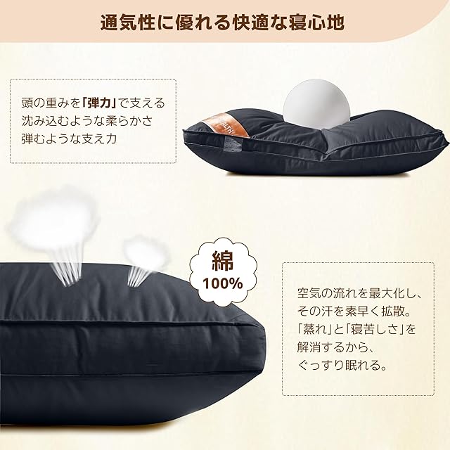【立体構造】柔らかさと高反発性を兼ね備えた構造であり、ボリューム感よく、羽毛のように叩けばふわーっと飛 び散る性質をもっています。適度な復元力と弾力があり、しっかりと頭を支え、お好きな寝姿でぐっすり眠れます。