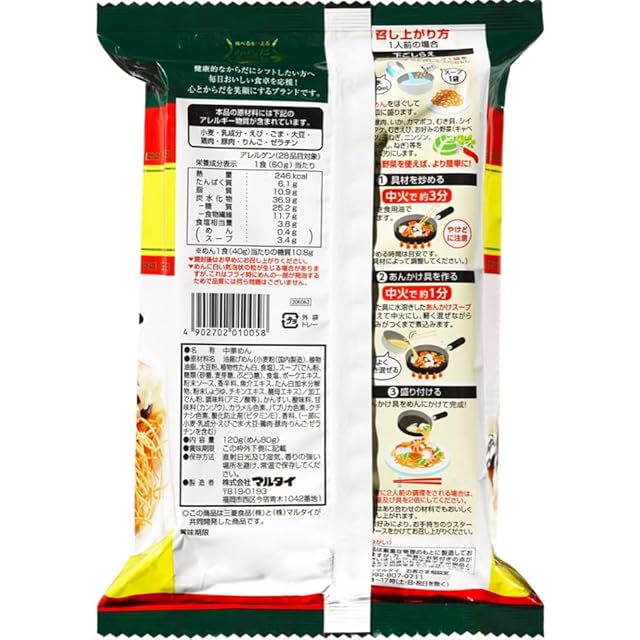 原材料:油揚げめん〔小麦粉(国内製造)、植物油脂、大豆粉、植物性たん白、食塩〕、スープ〔でん粉、糖類(砂糖、麦芽糖、ぶどう糖)、食塩、ポークエキス、粉末ソース、香辛料、魚介エキス、たん白加水分解物、粉末しょうゆ、チキンエキス、酵母エキス〕/加工でん粉、調味料(アミノ酸等)、かんすい、酸味料、甘味料(カンゾウ)、カラメル色素、パプリカ色素、クチナシ色素、酸化防止剤(ビタミンE)、香料、(一部に小麦・乳成分・えび・ごま・大豆・鶏肉・豚肉・りんご・ゼラチンを含む)