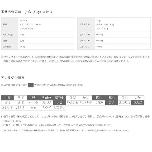 原材料:油揚げめん(小麦粉、植物油脂、食塩、糖類、醤油、ポークエキス、チキンエキス、たん白加水分解物)、フライドポテト、豚脂、味付豚肉、カレー粉、小麦粉、カレー調味料、野菜エキス、でん粉、玉ねぎ、人参、糖類、マーガリン、食塩、香味調味料、魚介エキス、ピーナッツバター、ねぎ、香味油、加工でん粉、調味料(アミノ酸等)、カラメル色素、炭酸Ca、増粘多糖類、かんすい、乳化剤、香料、酸味料、酸化防止剤(ビタミンE)、カロチノイド色素、香辛料抽出物、ビタミンB2、ビタミンB1、(原材料の一部に卵、乳成分、りんごを含む)
