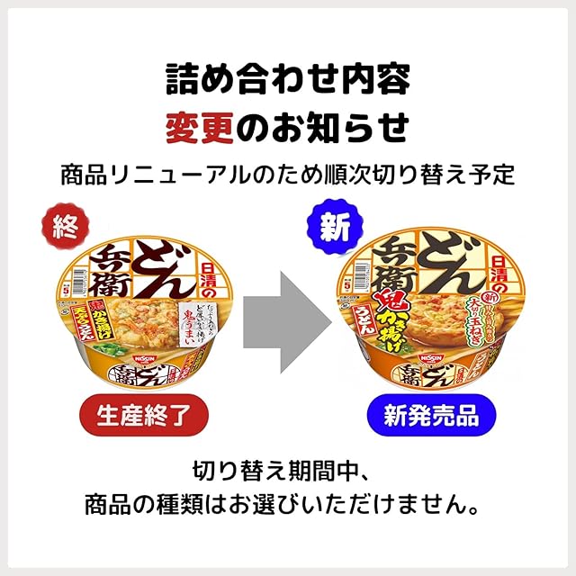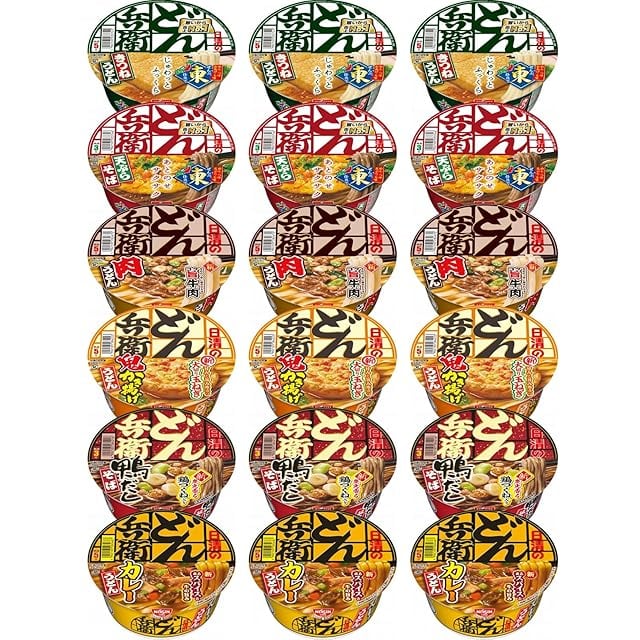 内容量:日清のどん兵衛 きつねうどん(東) 96g×3個、日清のどん兵衛天ぷらそば(東) 100g×3個、日清食品 どん兵衛 カレーうどん 87g×3個、日清のどん兵衛肉うどん 87g×3個、日清のどん兵衛 鴨だしそば 105g×3個、日清のどん兵衛かき揚げ天ぷらうどん 97g×3個