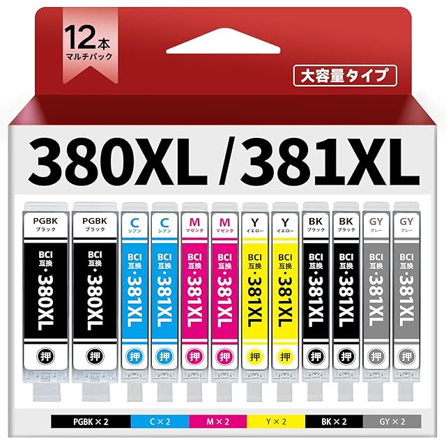 【商品仕様】 互換インクカートリッジ BCI-381XL + BCI-380XL 6色12本パック: BCI-380XLPGBK (ブラック) 2本 / BCI-381XLBK (ブラック) 2本 / BCI-381XLC (シアン) 2本 / BCI-381XLM (マゼンタ) 2本 / BCI-381XLY (イエロー) 2本 / BCI-381XLGY (グレー)2本 ※メーカー純正品ではありませんが、純正品との併用は問題ありません。