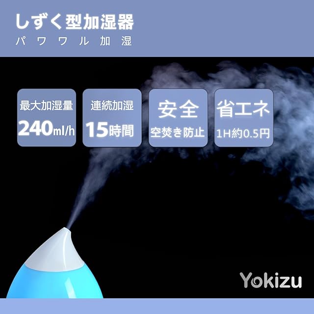 Yokizu 加湿器 卓上 小型 アロマ 大容量 おしゃれ しずく型 超音波式 LEDライト 寝室 静音 加湿機 6畳 8畳 10畳対応 お手入れ簡単 乾燥対策 15時間連続稼働 省エネ 空焚き防止 デスク オフィス リビング コンパクト ブルー