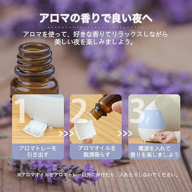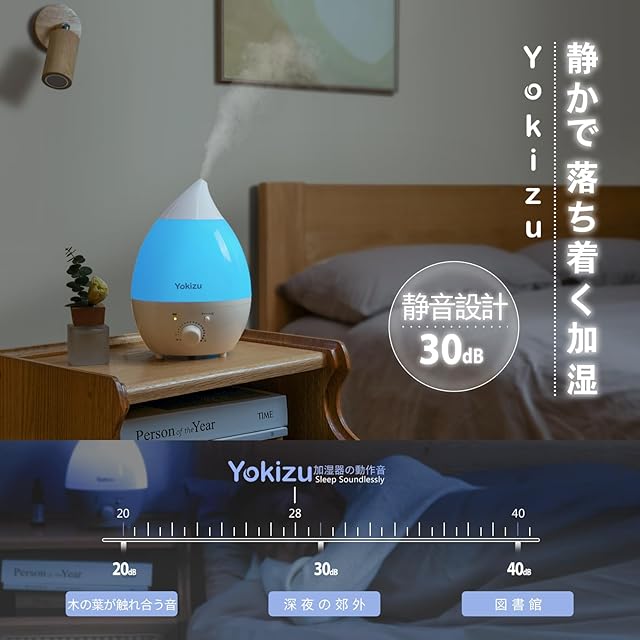 【静音・アロマ対応・LEDライト搭載】図書館よりも静かな28dB以下の運転音で深夜でも気にならない低騒音設計です。敏感で音が気になる方でもぐっすり眠れます。赤ちゃんの部屋、会社などにもご利用いただけます。アロマオイルをアロマトレーに垂らせばお好みの香りが部屋全体に広がります。さらにナイトライトは7色に変化し、美しい夜の雰囲気を作りだしましょう。便利な消灯機能:LEDライトボタンを2~3秒を押し続けると消灯します。