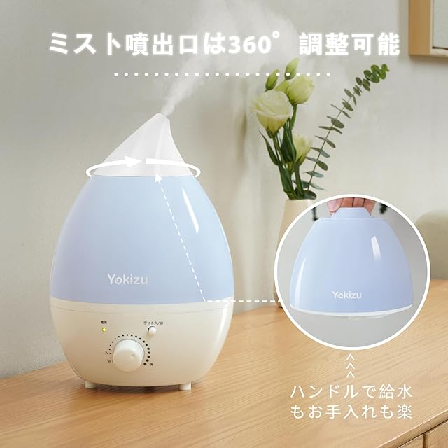 【かわいいしずく型・手入れしやすい】シンプルな小型加湿器で、寝室やリビング、オフィスにぴったりです。ハンドル付きで持ちやすく、給水やお手入れの際に便利です。吹出口は360°回転できるので、壁や家具にミストが付着してしまう心配もありません、狙った場所を効率よく加湿できます。